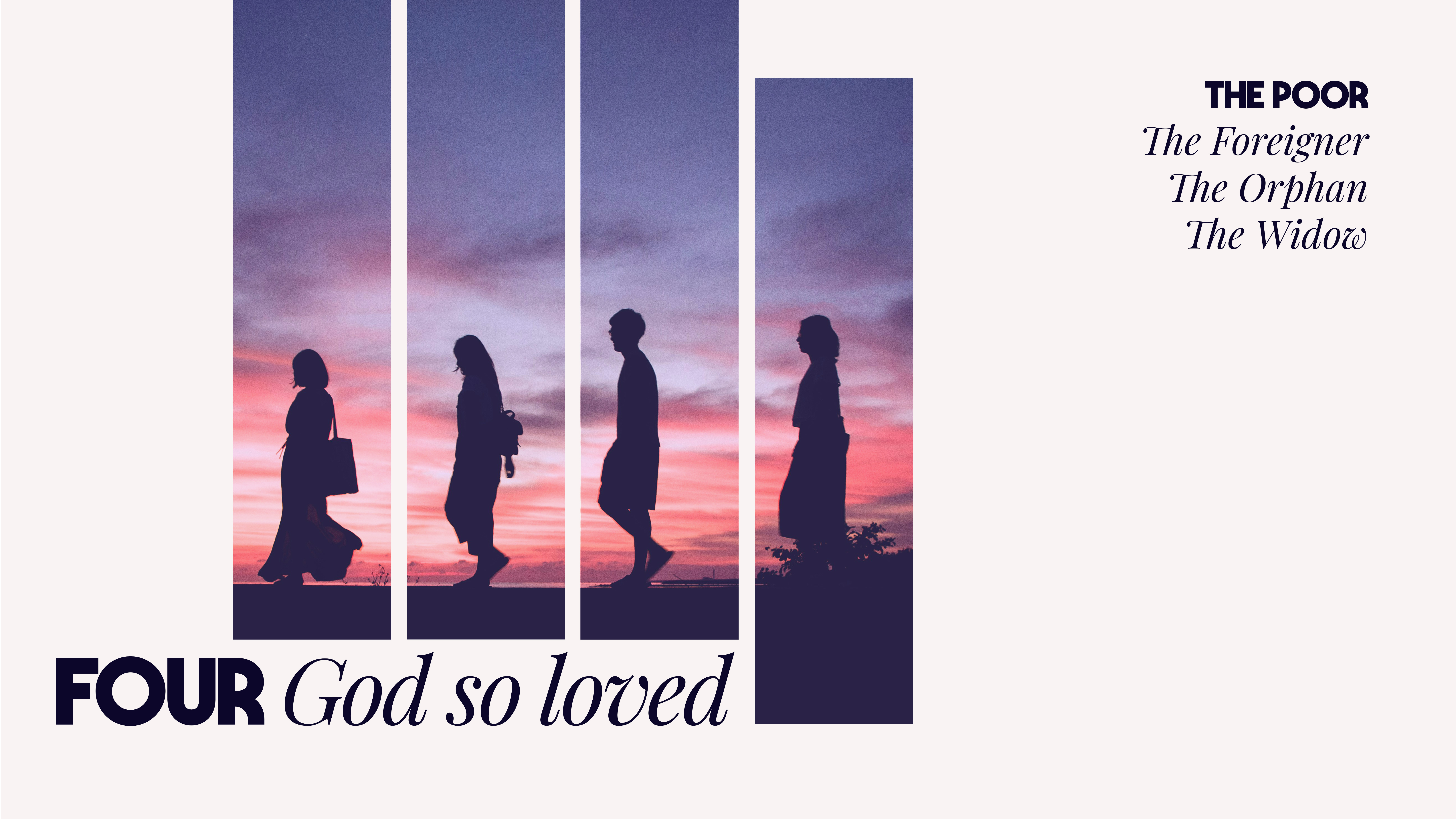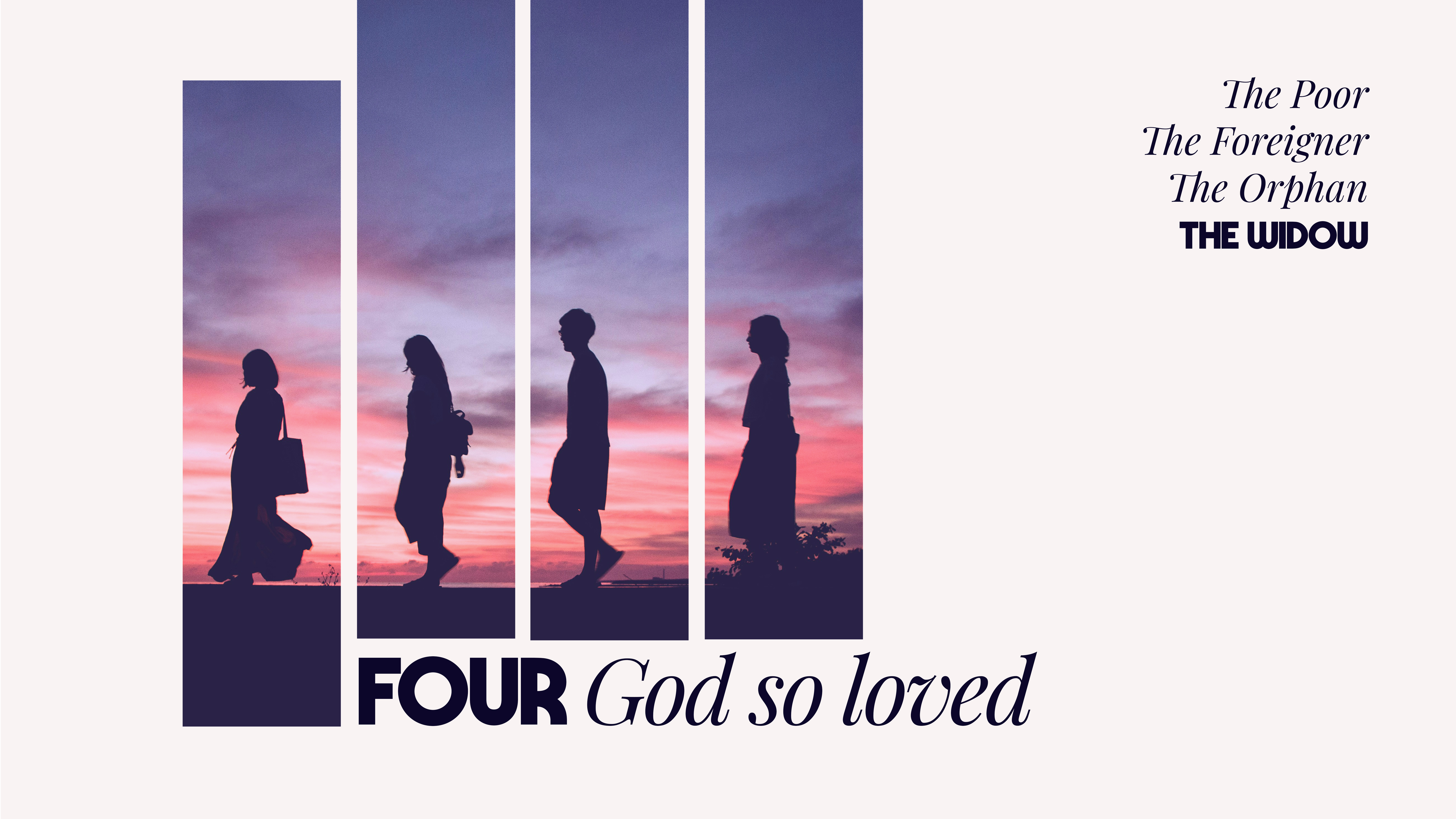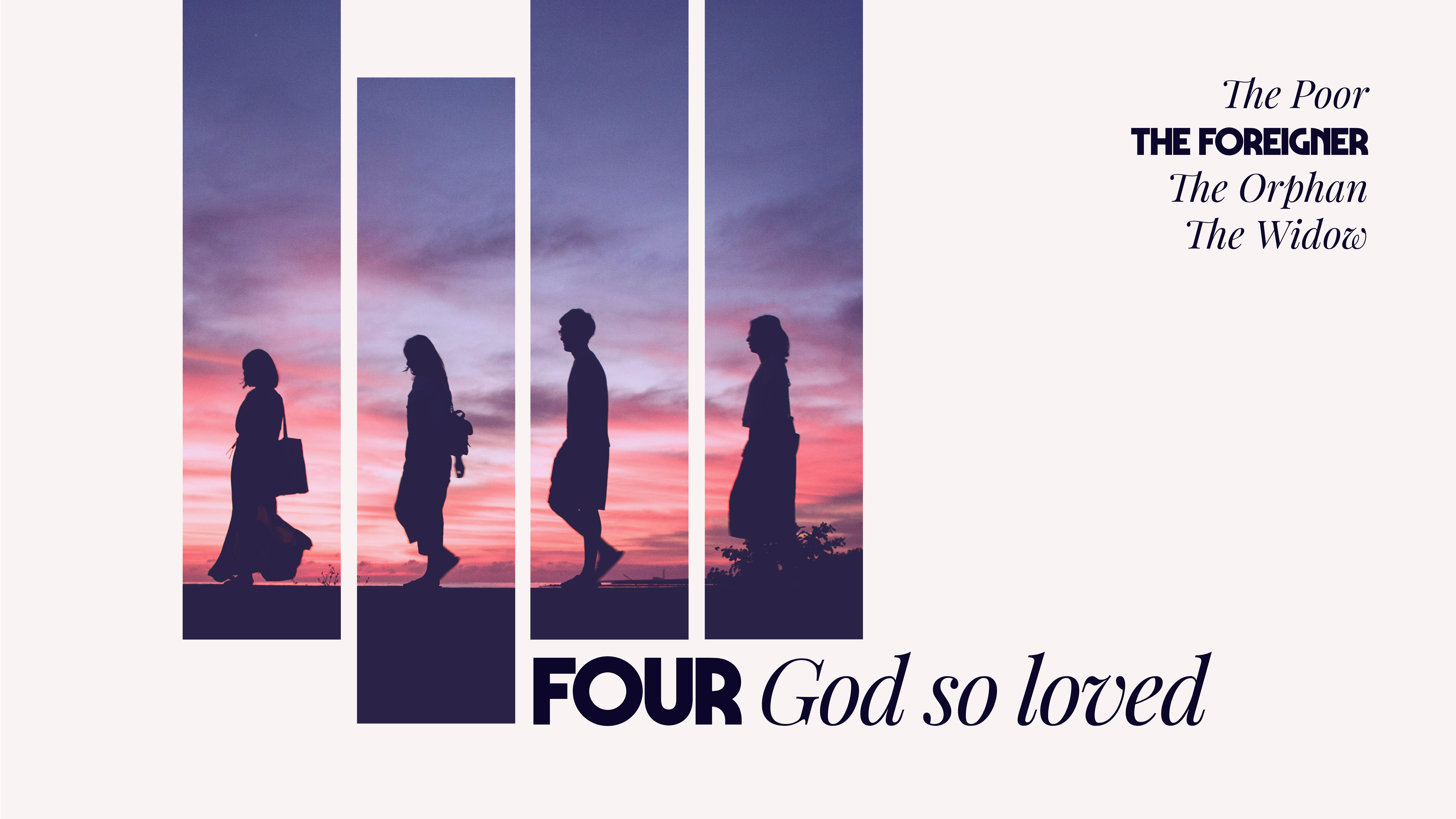 Series Summary: Starting April 27th, Four God So Loved invites us to remember God's love for four particular groups of people: the poor, the foreigner, the orphan and the widow, also known as the "quartet of the vulnerable. " Throughout Scripture, God demonstrates a special concern for the wellbeing of this quartet and calls his people to do the same. God not only remembers their vulnerability and cries for justice, he also works to "re-member" them back into community so that they can live as equal members within the Body of Christ. God’s love for this quartet grounds and shapes our own calling to love and re-member the vulnerable in our own communities.